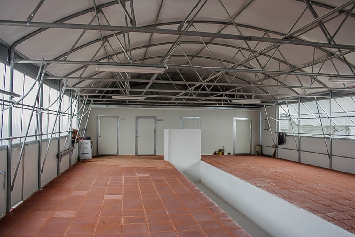 Στην διπλανή εικόνα διακρίνεται η εσωτερική διαμόρφωση αμελκηρίου θερμοκηπιακού τύπου. Στο πίσω μέρος φαίνονται οι τέσσερις πόρτες που οδηγούν στους βοηθητικούς χώρους του ποιμνιοστασίου και είναι: