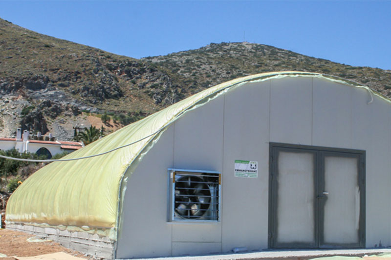 Οι προσόψεις του θαλάμου καλύπτονται από πάνελ πολυουρεθάνης πάχους 40mm. Οι διαστάσεις που προτίνουμε σαν ιδανικές για τους θαλάμους αυτούς είναι 8.5m X 26m για να μπορούν να συνδυαστούν καλύτερα ο μηχανολογικός εξοπλισμός ελέγχου του κλίματος σε σχέση με την αντοχή του μύκητα σε ιδανική ταχύτητα αέρα μέσα στον θάλαμο.