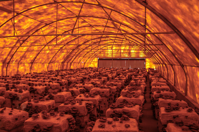 Εσωτερικό από θάλαμο παραγωγής μανιταριών Πλευρώτους. Η χρήση διαπερατού στο φως υαλοβάμβακα γίνεται γιατί ο συγκεκριμένος μύκητας χρειάζεται φως για να αναπτυχθεί σωστά. Στο βάθος διακρίνεται το υδροπάνελ δροσισμού.